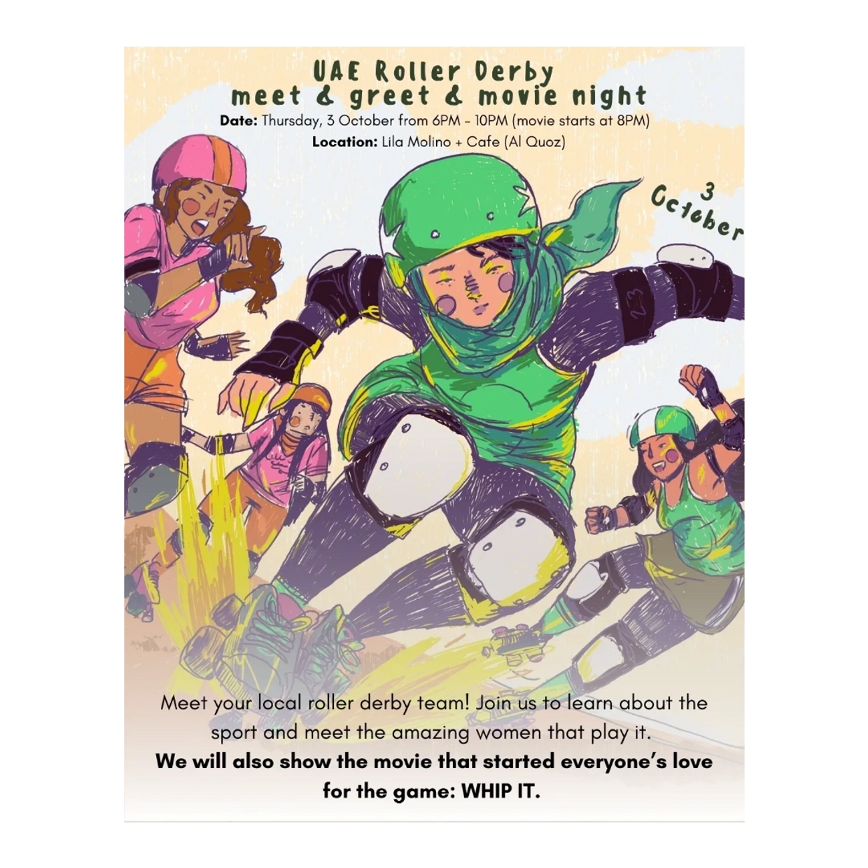 Join us Thursday evening for food, company and a movie. Learn about the sport of roller derby and meet the amazing ladies that play it here in the UAE!